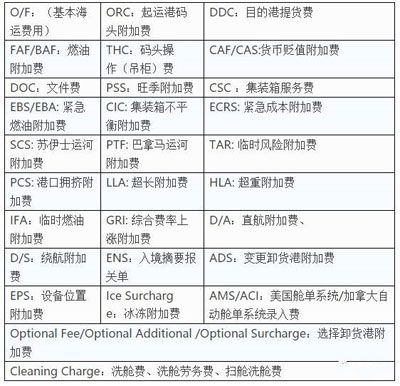 欧洲线:O/F基本海运费用+ORC起运港码头附加费+BAF燃油附加费+CAF货币贬值附加费+DOC文件费
