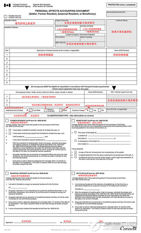 许多移民加拿大的朋友都会将国内的一些私人物品随身带过去,当你以新移民的身份第一次登陆加拿大的时候,在海关要你填写一份B4表格,这份表格关系到你免税将私人物品托运到加拿大,那么我们如何填写B4表格呢?在这里熙浦国际搬家为加拿大的新移民朋友提供一份填写B4E填写指南,希望有所帮助。如果哪位朋友不懂也可以致电咨询熙浦的工作人员为您详细解答!