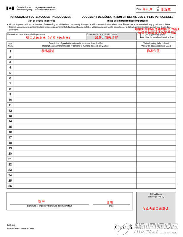 加拿大海关B4E declaration form表格为加拿大海关要求收货人在目的国填写的私人物品清关表格,物品需要向移民局提前申报批准免税进口。加拿大海关需要收货人在其入境机场填写B4E表格并由海关盖章,为了后续货物到达时清关所用。收货人在货物抵达时,必须本人带好相关文件,出席海关面试。一般情况下加拿大开关是在新移民客户首次登陆时机场领取填写,并在机场海关加盖海关章,B4表格会在申报后1年内有效。如收货人在机场未领取到相应文件,请不要担心,可以在货物抵达港口前,在当地海关办事处申请补办。