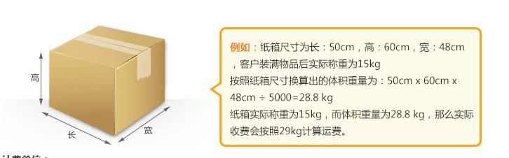 DHL、UPS、FEDEX、TNT体积重计算公式:长*宽*高(cm)/5000=体积重(kg),也就是每5000立方厘米就等于1公斤。