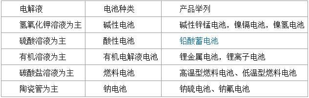 电池可以根据电解液的化学属性,简单分类为五类,具体如下表所示。