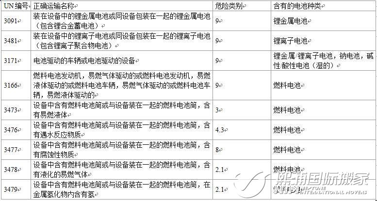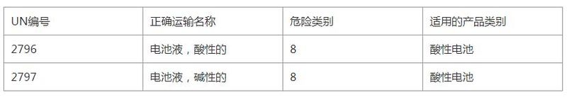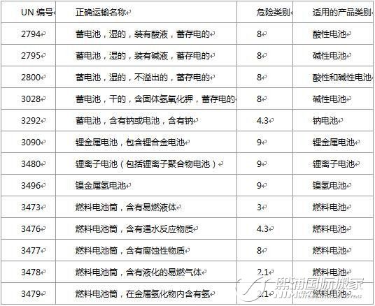 电池在运输时,其危险性主要由于其含有的电解液所引起的,电解液的危害性决定了电池本身的危险性。目前,根据国际海运危规(IMDG code 37-14版),常见的电池产品的危险性可分为第8类腐蚀品,第9类杂项危险性、第3类易燃液体、第2.1类易燃气体和第4.3项遇水放出易燃气体这五种,其对应的UN编号如下表所示。