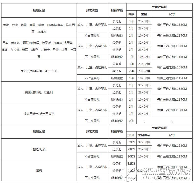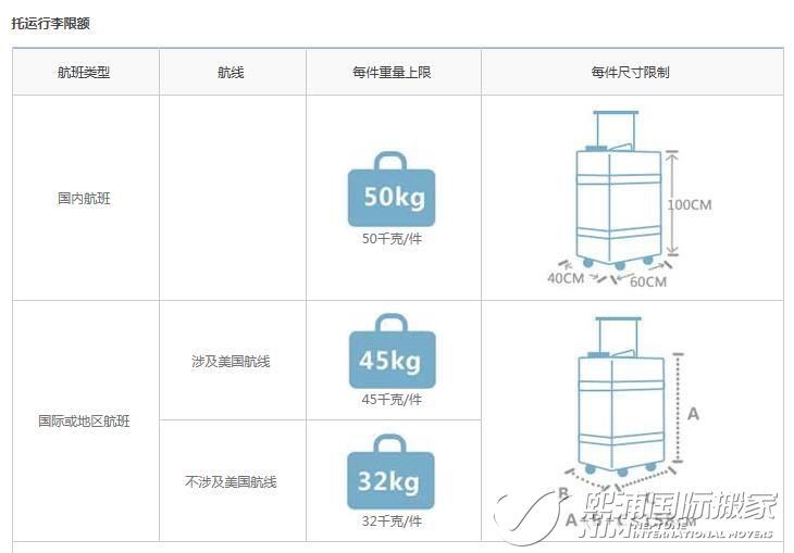 2)除美加航线外:托运1件,23千克,三边之和 ≦ 158CM;手提1件,10千克 ,三边之和 ≦ 115CM。