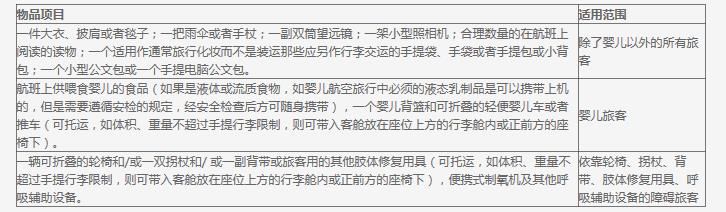 1、成人、儿童及占座婴儿旅客乘客均可免费携带一件经过安检的随身携带行李(注:婴儿旅客无免费行李);
