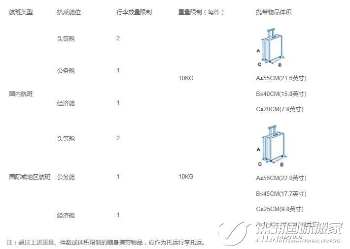 ②头等舱、公务舱:限制数量2件,每件重量低于8Kg(17磅)。