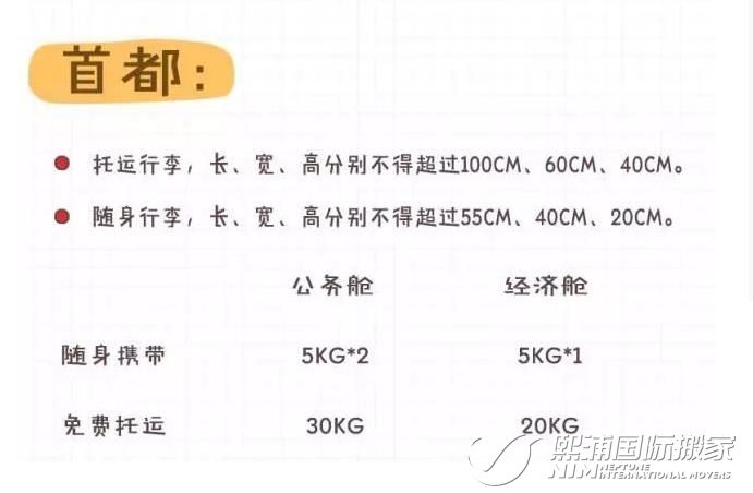 4)其它目的地来回的航班(无件数限制):30千克,最大尺寸为300厘米;手提1件,7千克,50x37x25厘米。
