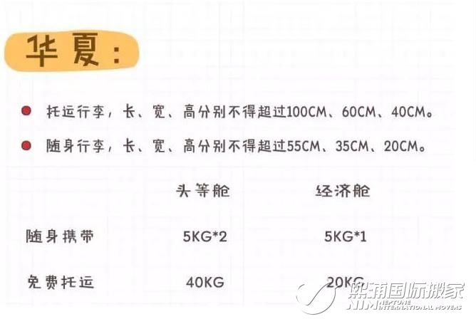 4)韩国国内航线:托运20 千克;手提12 千克,三边之和 ≦ 115CM。