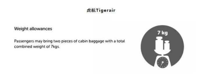 Tiger同样是限制每人可以携带两件行李,总重量7公斤以内,电脑也会计算在其中。乘客可以付费升级到Cabin+,最多可以携带12公斤手提行李登上飞机。