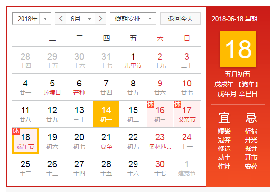 2018年6月16日(星期六)至6月18日(星期一)休息三天,节前2018年6月19日(星期二)正常上班;